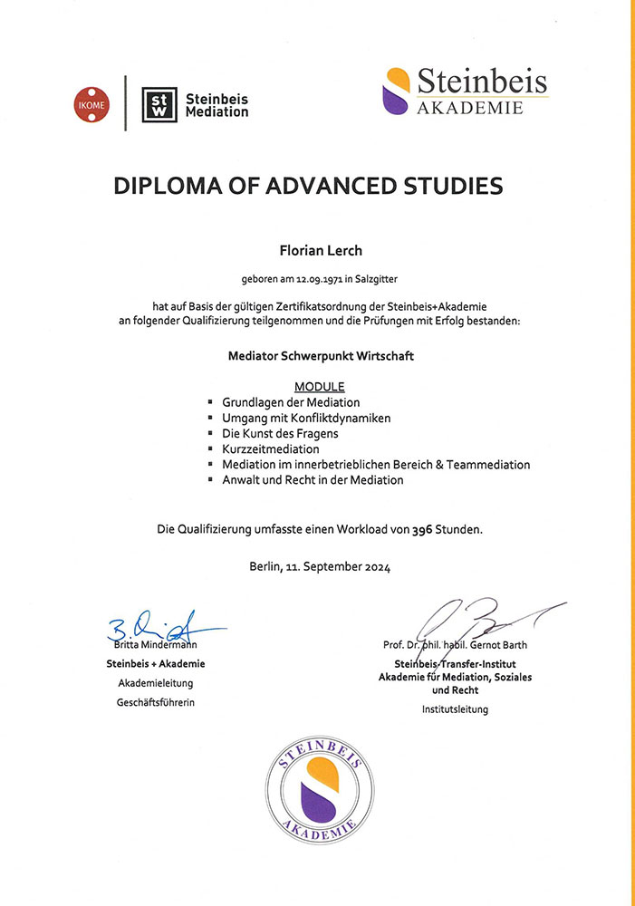 Weitere Infos zum Thema finden Sie in meinem Video zu meinem Werdegang vom Fleischerei-Inhaber zum Wirtschaftsmediator (ab ca. Minute 42:00).